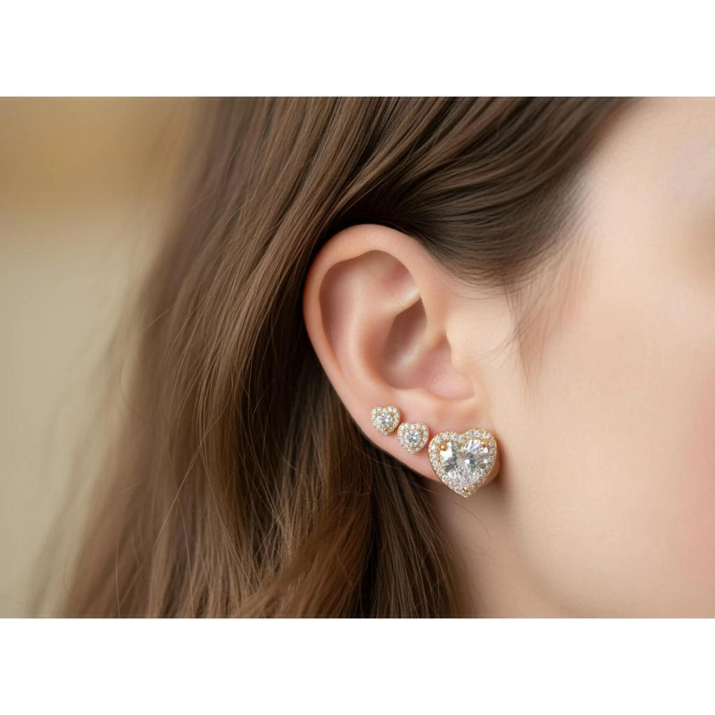 3 pares de brincos trio folheados a ouro coração pedras de zircônia cravejada Miri Morena 33235