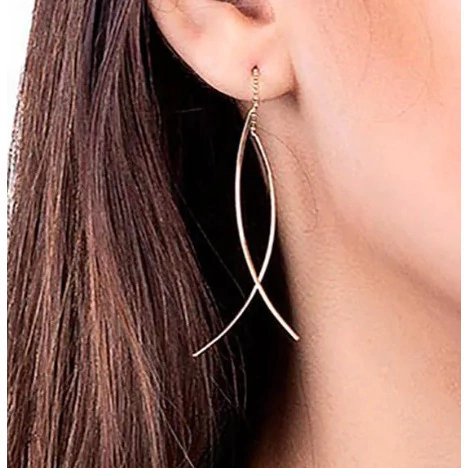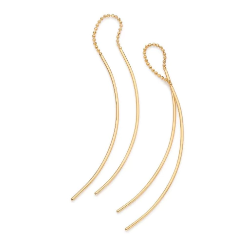 Este par de brincos Rommanel, com seus fios lisos delicadamente alongados, cai como um pêndulo dourado que dança a cada movimento, refletindo sutileza, feminilidade e presença.